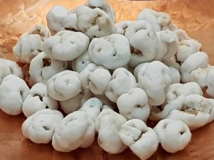 Noghls are sugar-coated almonds. Sugar, water, and rosewater are boiled to create a homogeneous liquid in which the roasted almonds are quickly submerged. When cooled, the coating solidifies, creating a sweet and crunchy white layer around the almonds.